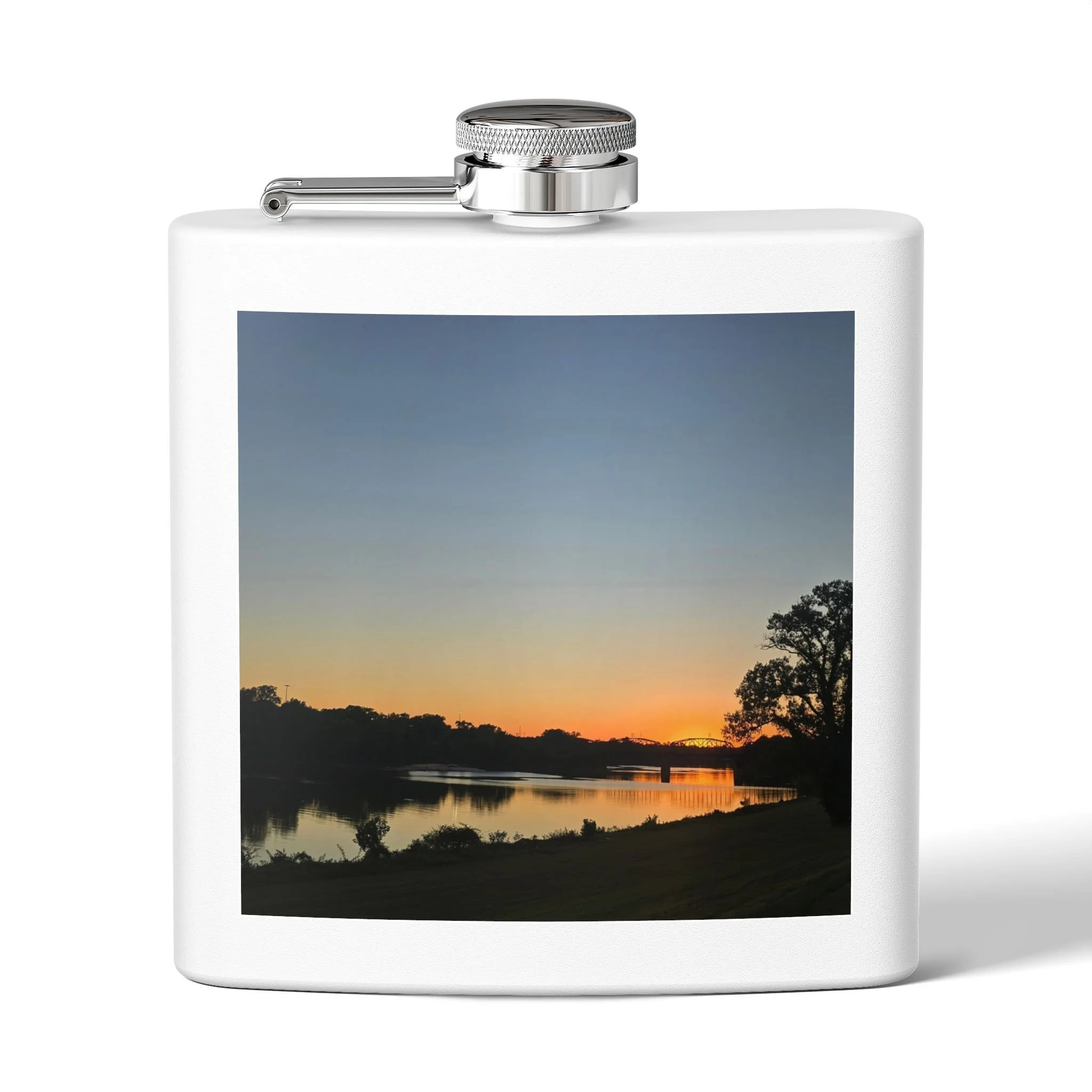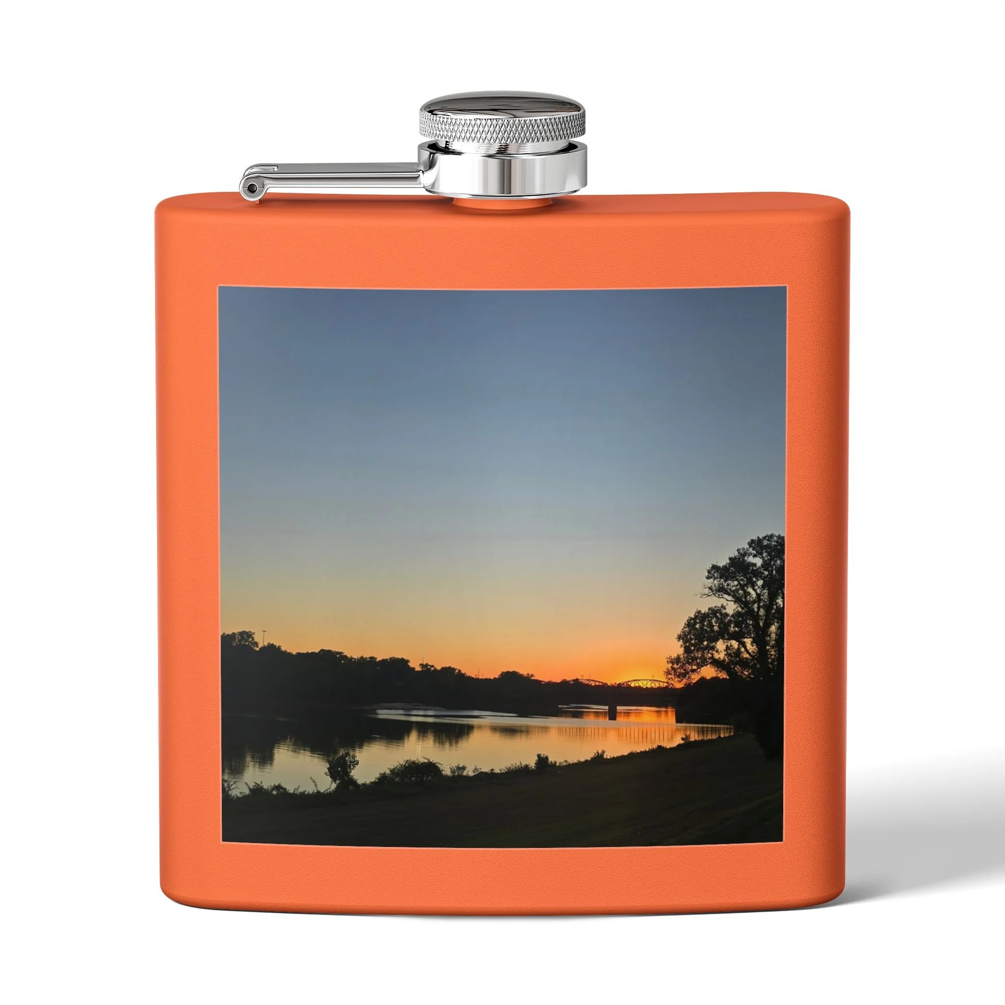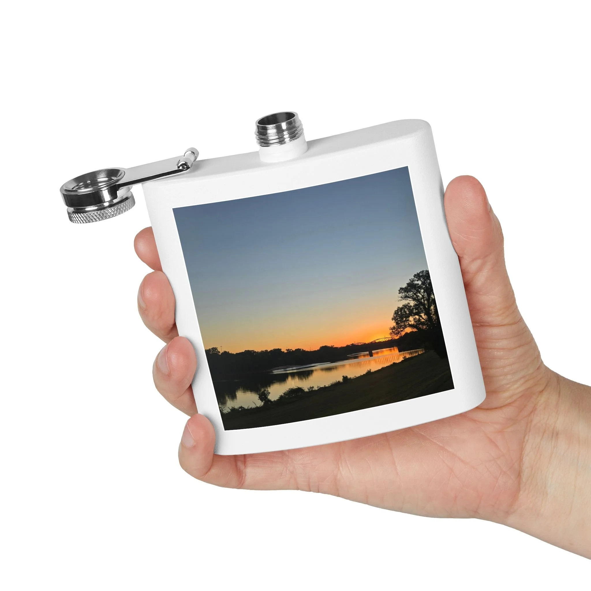 A 6oz stainless steel flask that carries a quiet, lakeside moment wherever you go. The compact, double-wall body holds drinks hot or cold for hours, while the powder-coated exterior and UV DTF-printed photo preserve a favorite sunset scene. The secure, leak-resistant lid with a handy latch keeps contents safe in a bag or pocket. It’s small enough for trail pockets, camping kits, or tucked into a coat — a personal talisman for evening walks, bonfire nights, or spontaneous rendezvous by the water.
