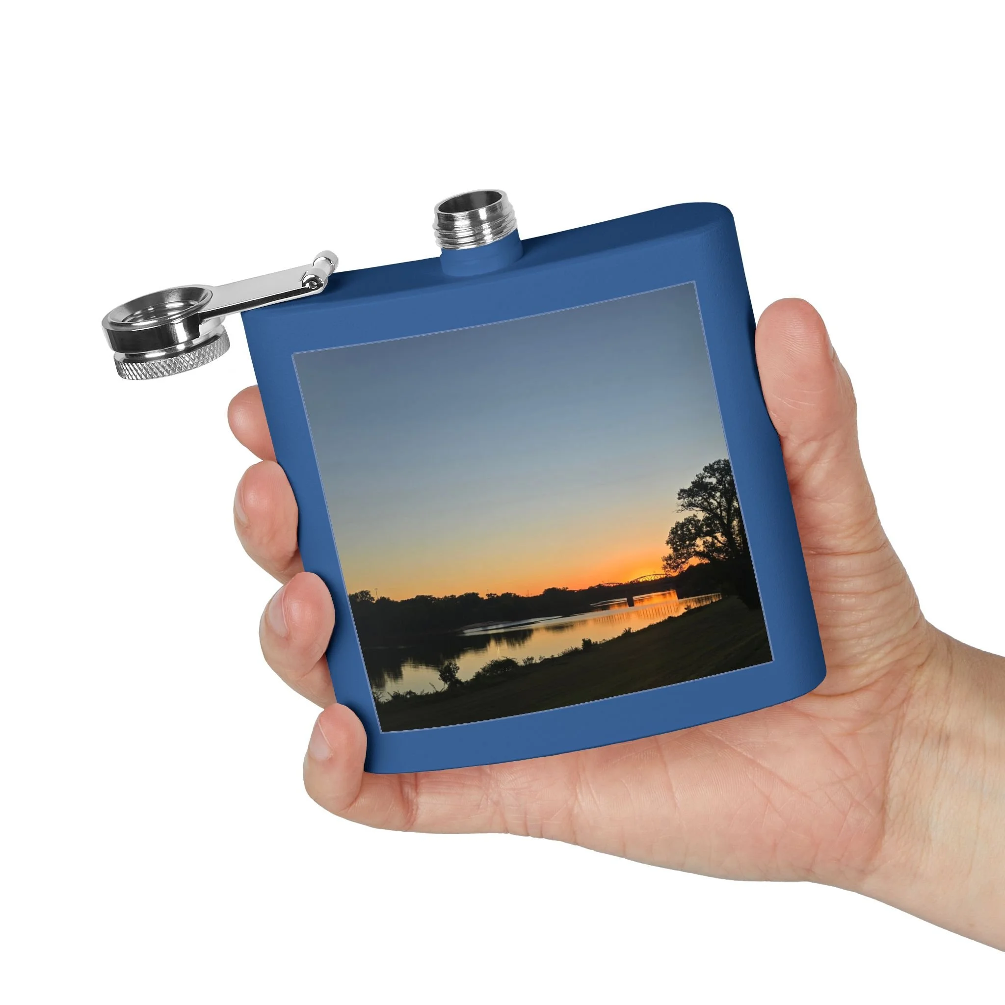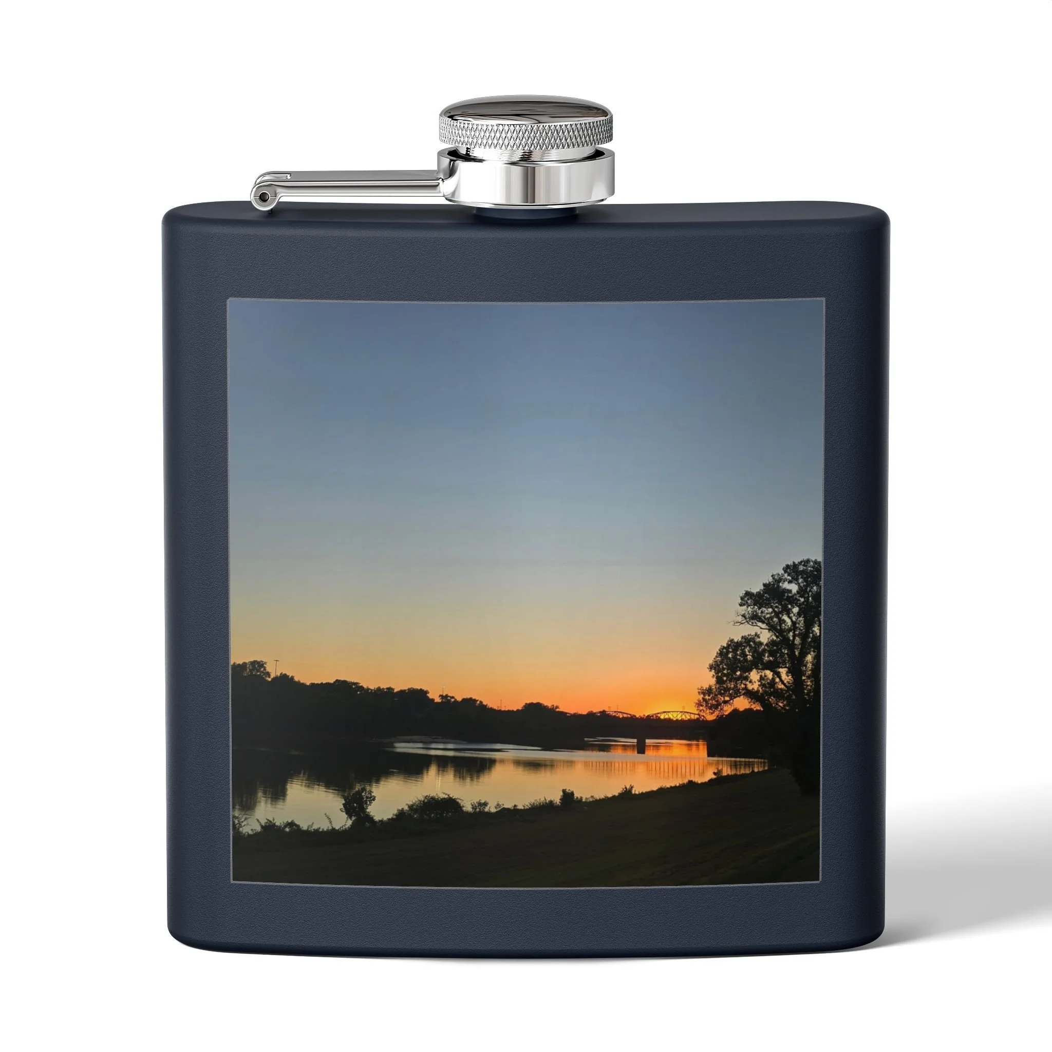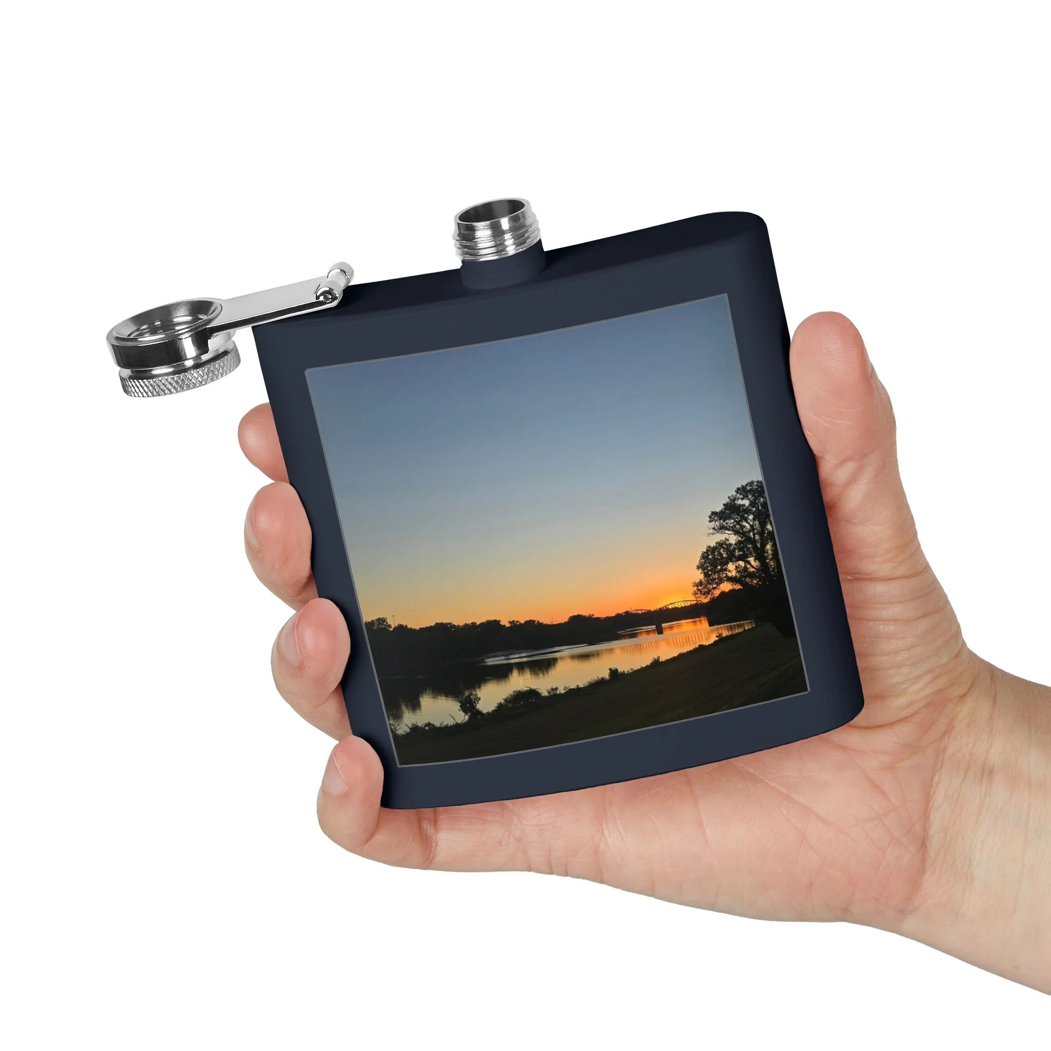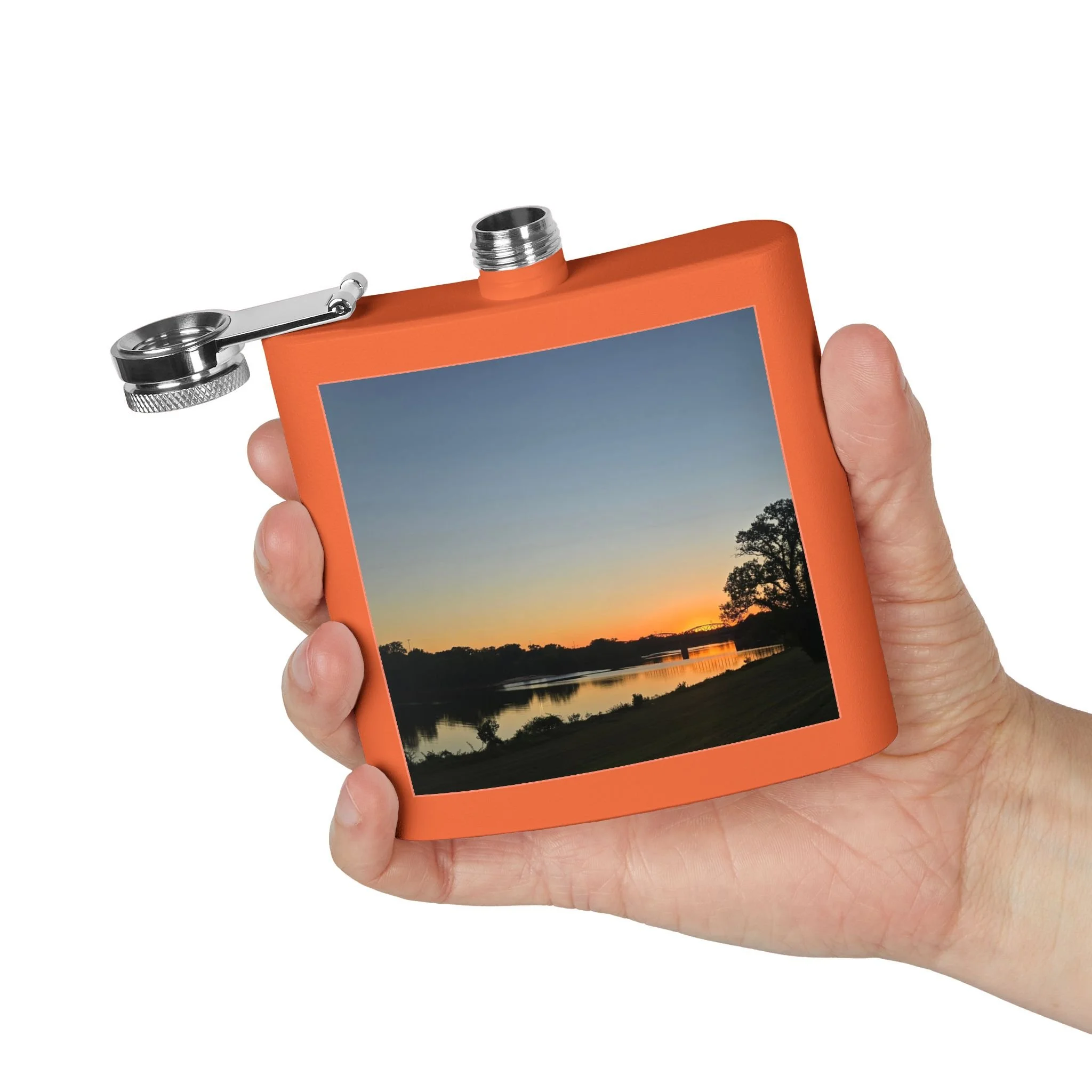 A 6oz stainless steel flask that carries a quiet, lakeside moment wherever you go. The compact, double-wall body holds drinks hot or cold for hours, while the powder-coated exterior and UV DTF-printed photo preserve a favorite sunset scene. The secure, leak-resistant lid with a handy latch keeps contents safe in a bag or pocket. It’s small enough for trail pockets, camping kits, or tucked into a coat — a personal talisman for evening walks, bonfire nights, or spontaneous rendezvous by the water.