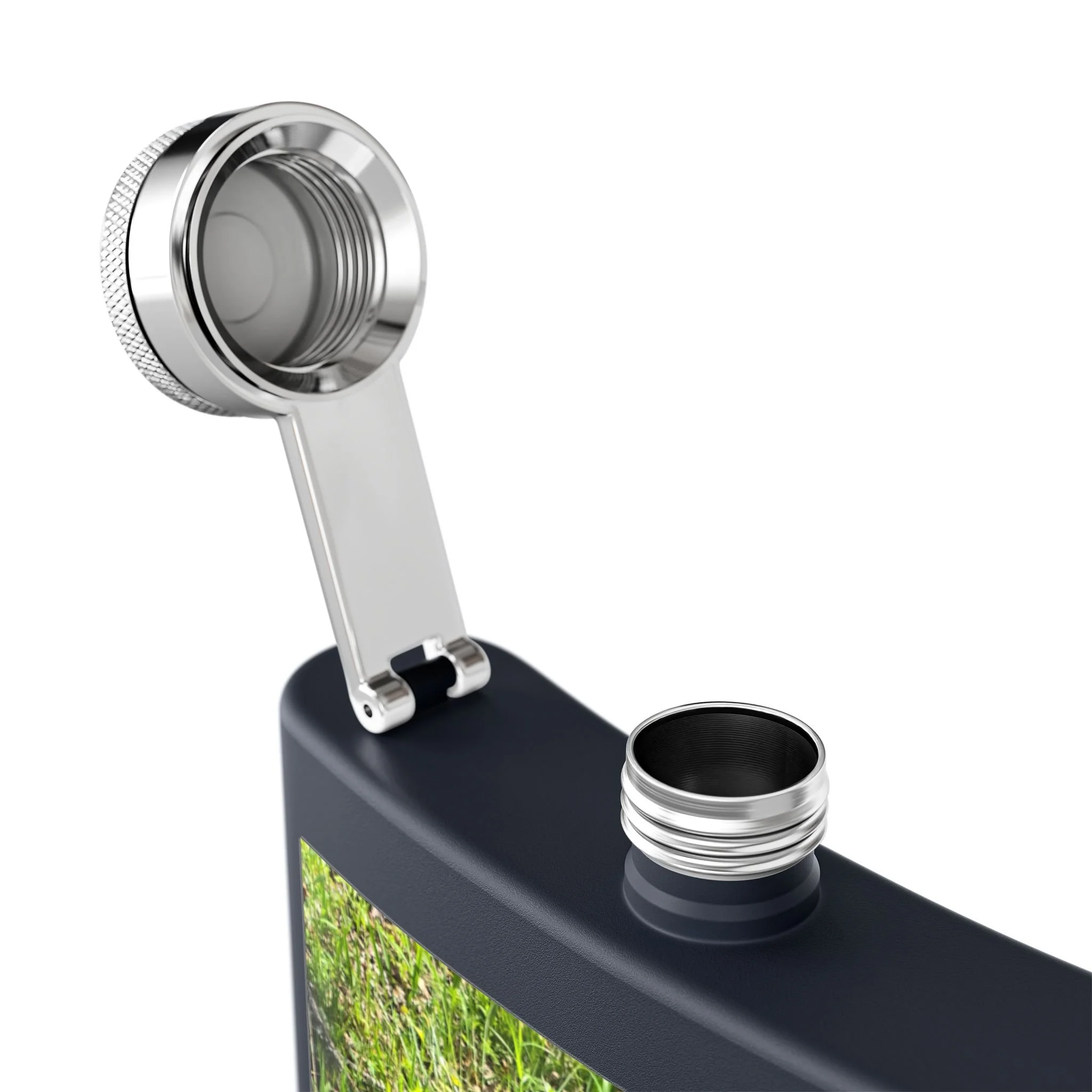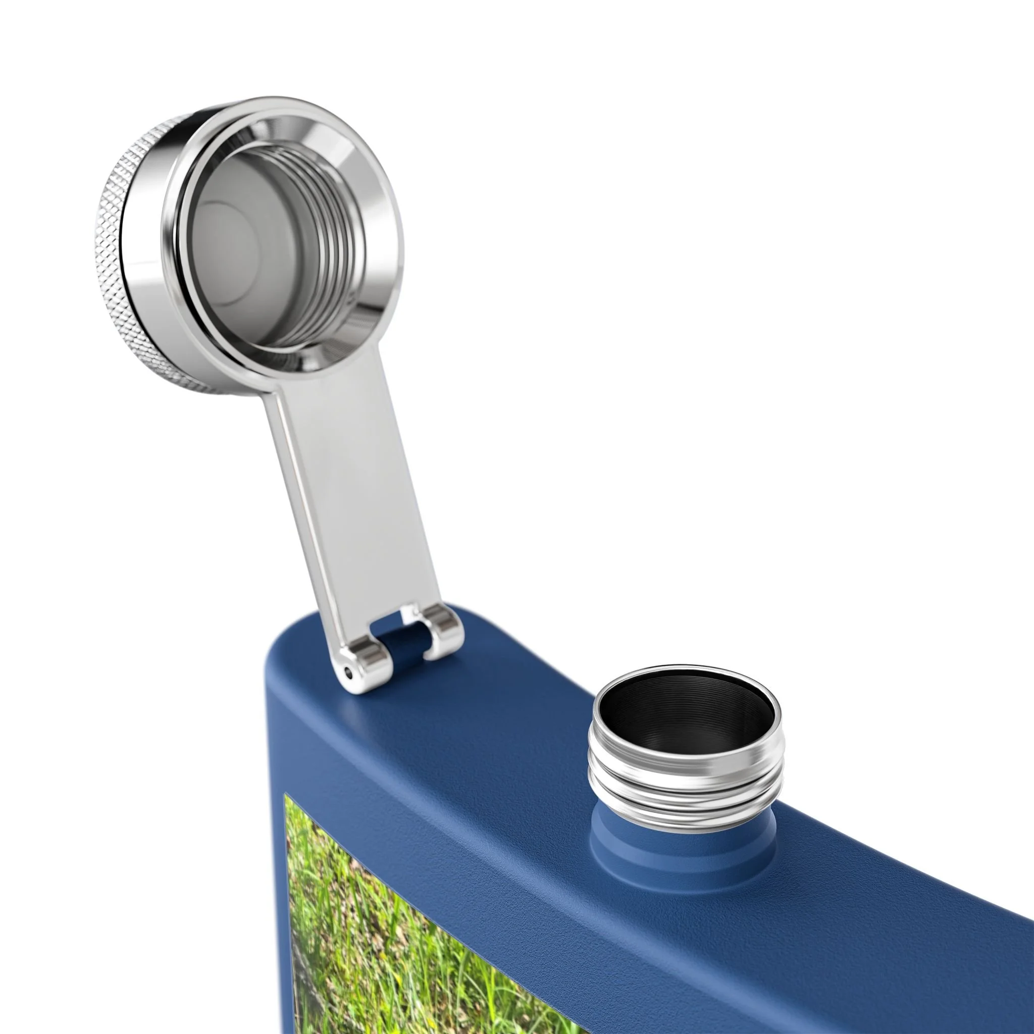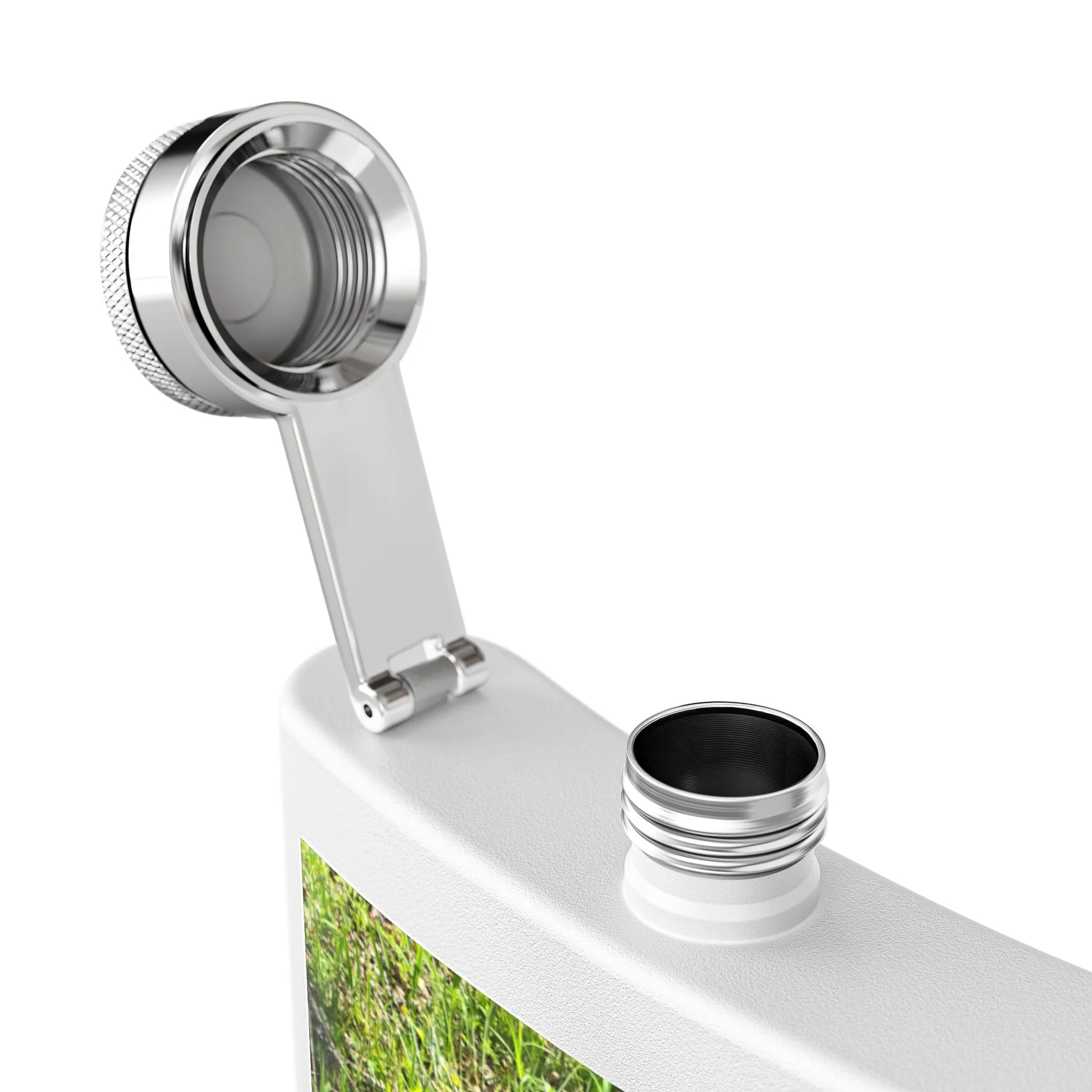 Slip this slim 6oz stainless steel flask into your pack and carry a quiet piece of the wild with you. The front bears a UV DTF-printed photograph of sunny yellow wildflowers set against green grasses—a small, honest snapshot of trail-side calm. The powder-coated finish gives the flask a soft, tactile feel while protecting the printed image. Double-wall insulation keeps a warm sip steady on a cold morning or a cool taste lingering through a hot afternoon. The leak-proof lid with a secure latch stays put during hikes, picnics, and quick stops along the road. Hand wash only to keep the print crisp and the powder coat bright.