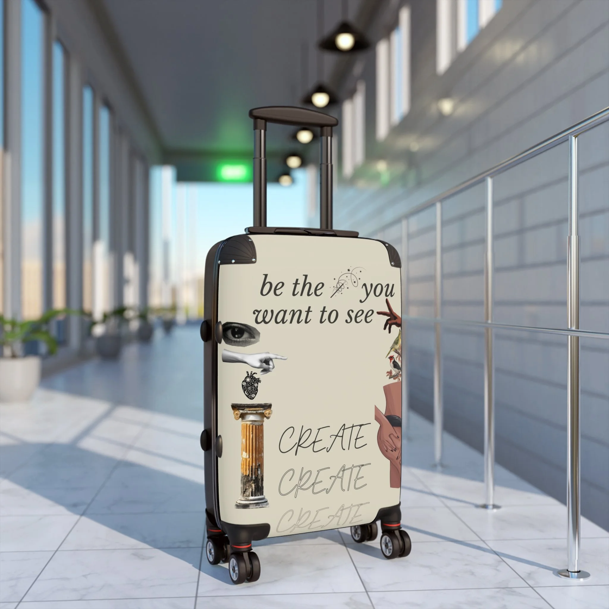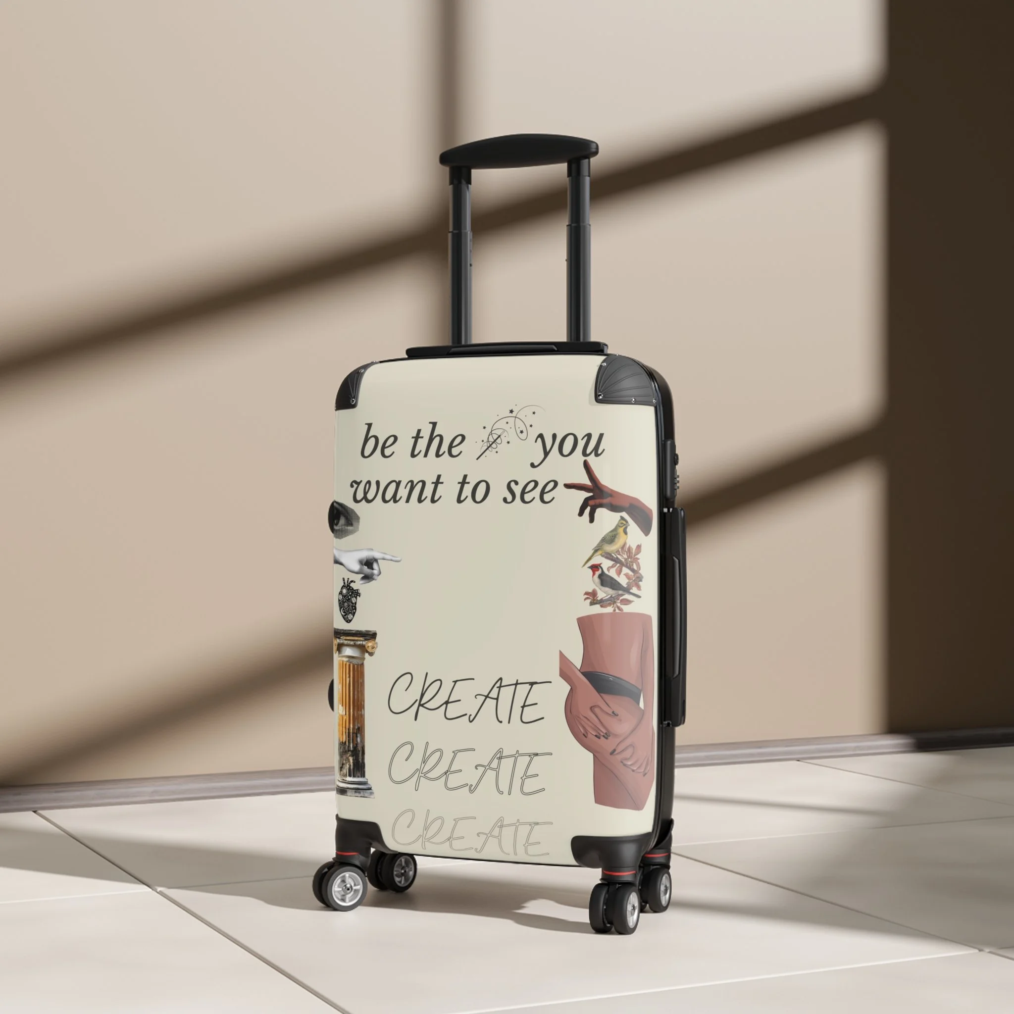 This hard-shell suitcase carries more than belongings — it carries intention. A lightweight polycarbonate front features an artsy collage and the words “be the you you want to see” and “CREATE,” turning travel into a moving mood board. Inside, tidy organization awaits with two inner pockets and a removable lining under a rubber seal, while an adjustable telescopic handle and smooth 360° double wheels make navigating airports calm and confident. Built-in lock and durable ABS back add security and impact resistance, so you can focus on the next creative stop rather than the luggage. It’s for the person who travels with plans, projects, and purpose — functional, secure, and visually expressive.