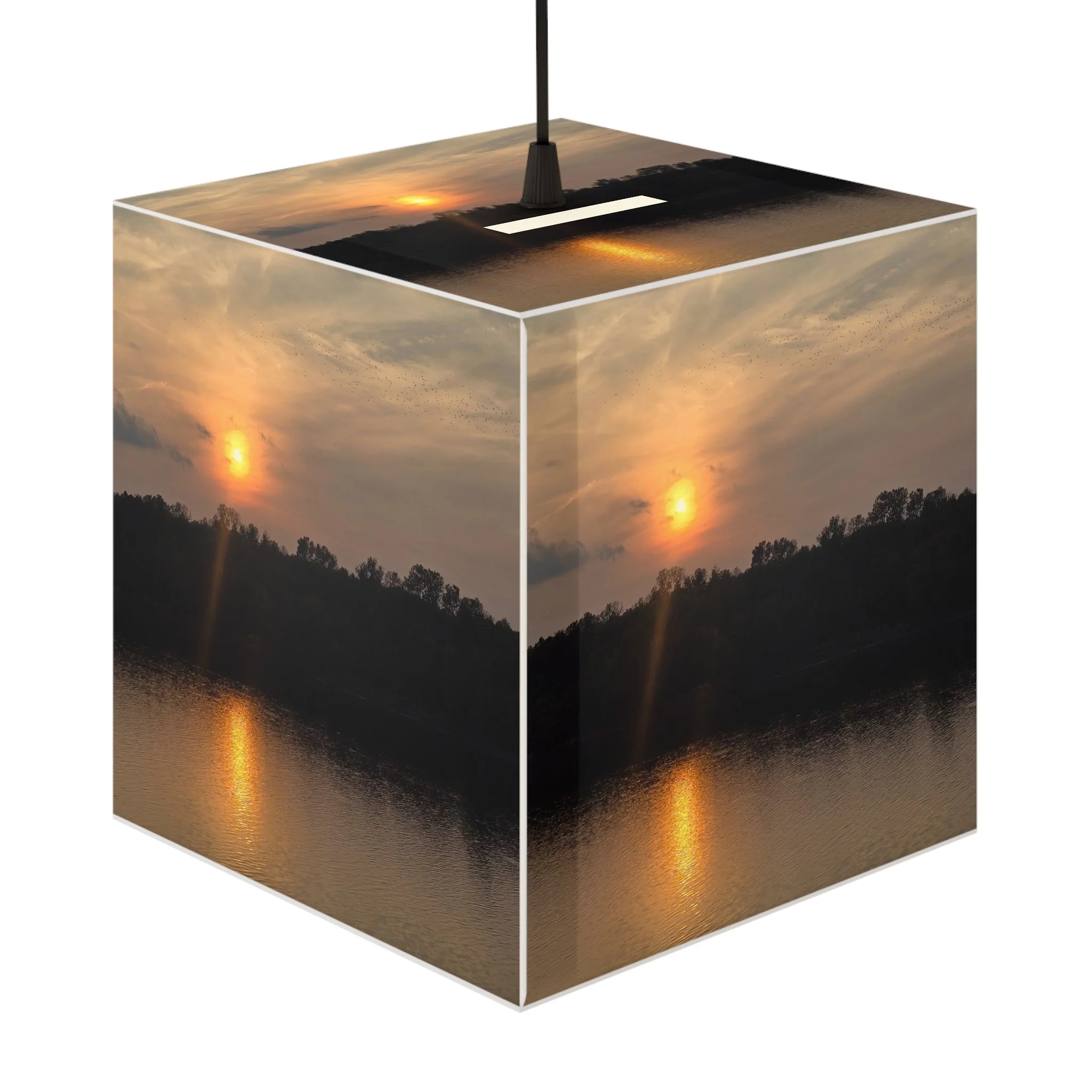 Soft, warm light captured in a compact geometric form. This light cube lamp wraps a tranquil sunset photo around a lightweight polyester shell, bathing a room in mellow amber tones and subtle reflections. Choose a tabletop setup with the included plug-in cord, or switch to the pendant option for a clean ceiling installation that increases overhead brightness. The matte-coated surface keeps glare low and lets the printed image hold rich, natural color while the flexible film maintains shape and resilience. It’s a quietly atmospheric piece that brings lakeside dusk and slow evenings into bedrooms, reading nooks, and cozy living corners.