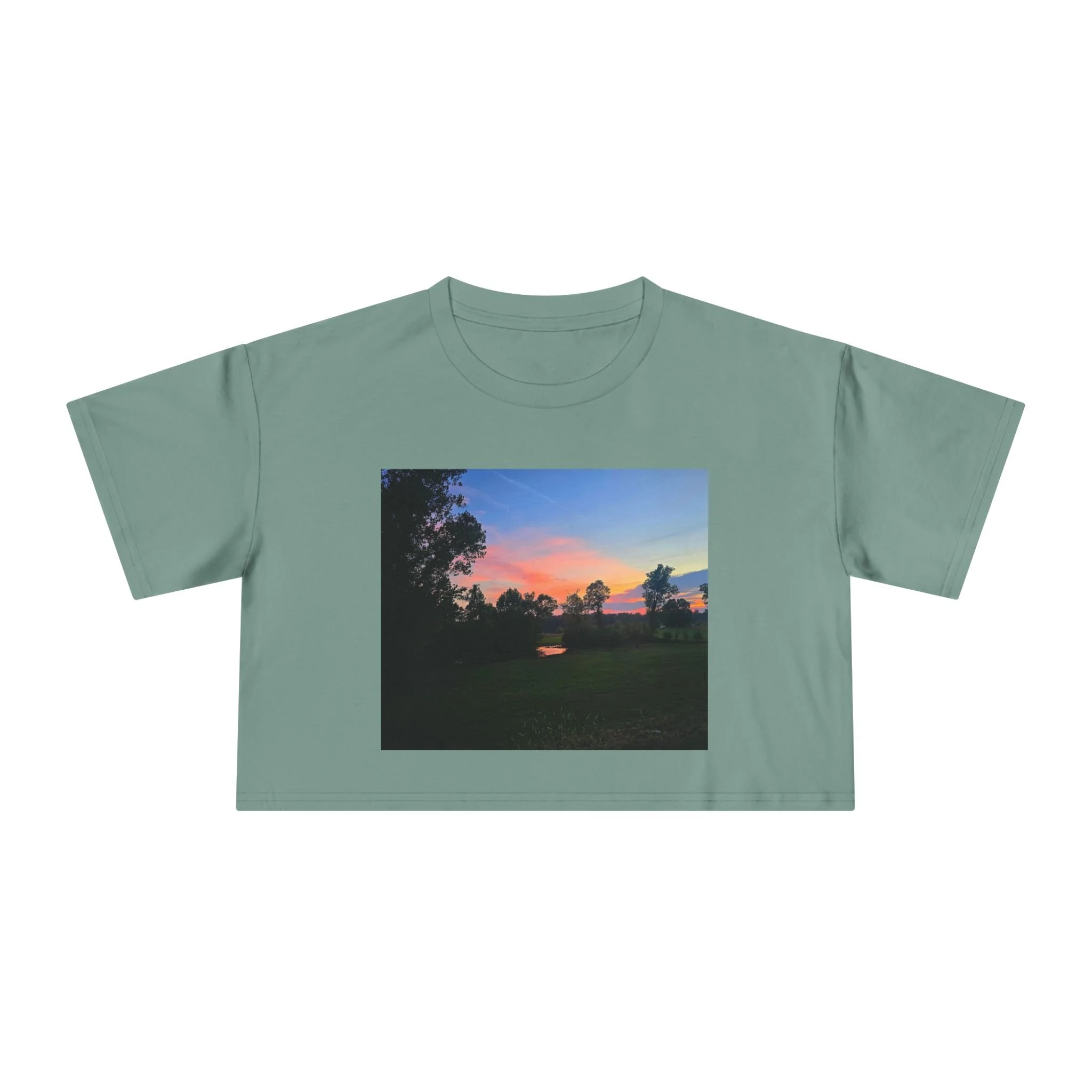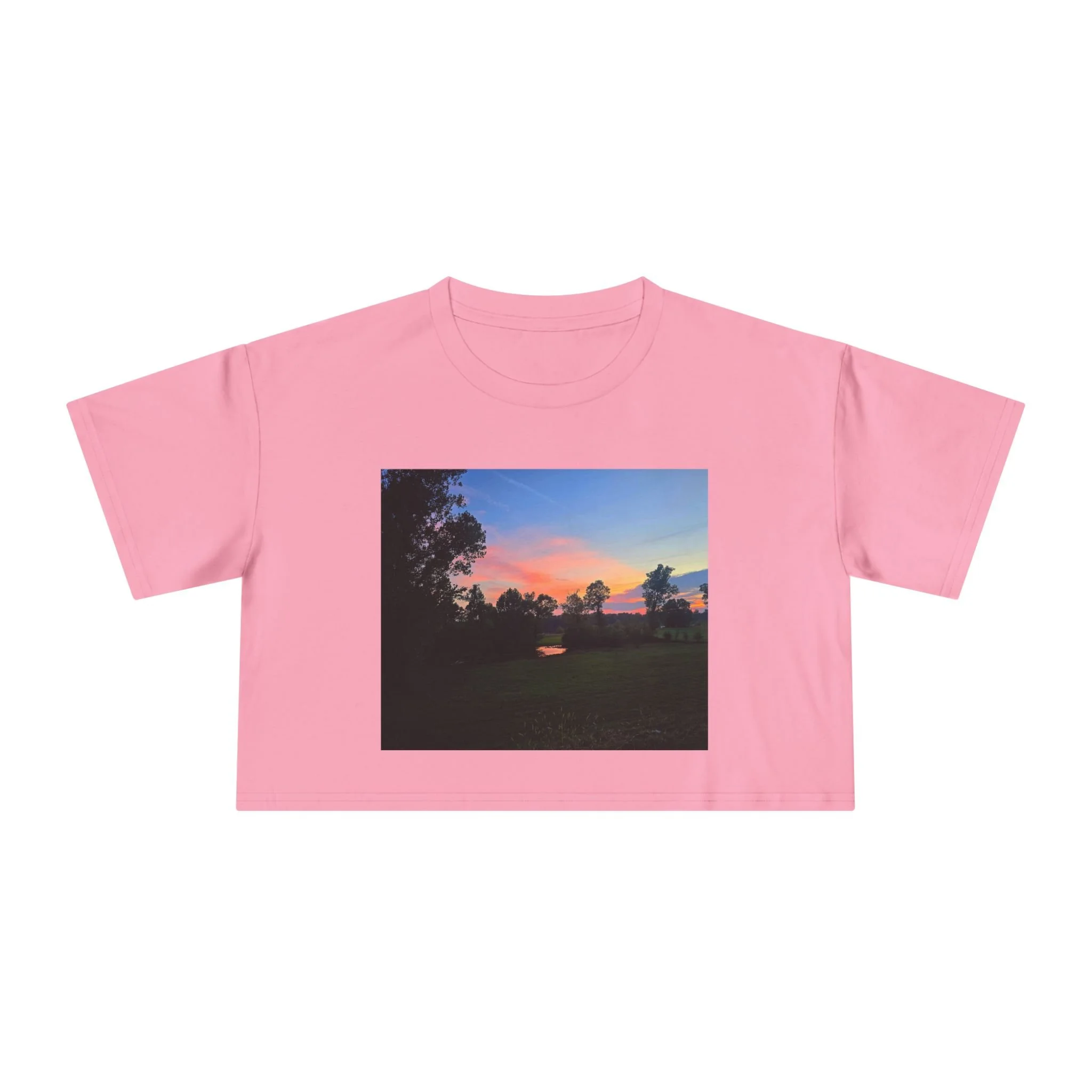 A relaxed, artful crop tee that carries the hush of evening light and a touch of playful charm. The image-front captures a watercolor sunset—soft pinks and deepening blues pooling over a quiet landscape—while the back features a circular, hand-lettered emblem with a subtle lip mark for personality. Lightweight yet durable, this crop sits with a gentle, dropped shoulder and a boxy silhouette that reads casual and confident. Wear it to slow-down moments: twilight walks, coffee-shop chats, or low-key nights with friends. It layers easily under a denim jacket or pairs with high-waisted jeans for a lived-in, personal look that feels like a memory you can fold into your day.